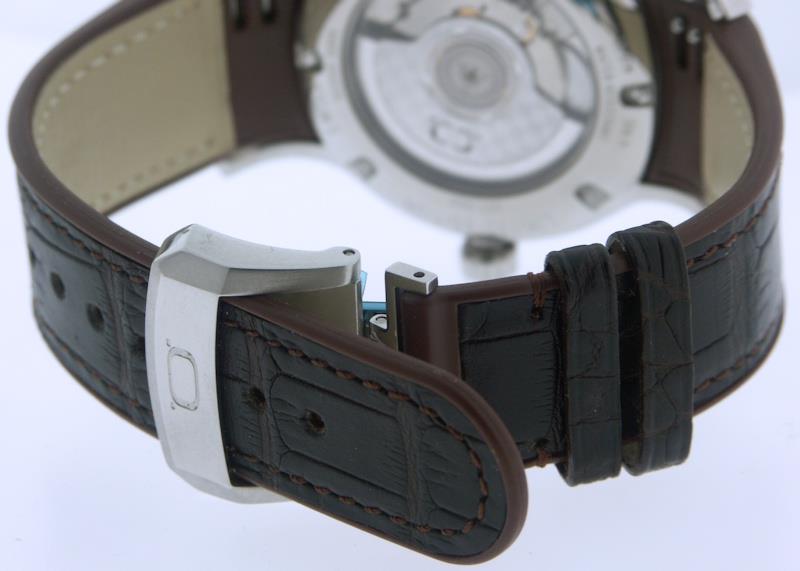 Genuine Alligator leather. Factory Logo embossed. Equipped with quick release feature. Comes with factory brown rubber and metal bracelet.
