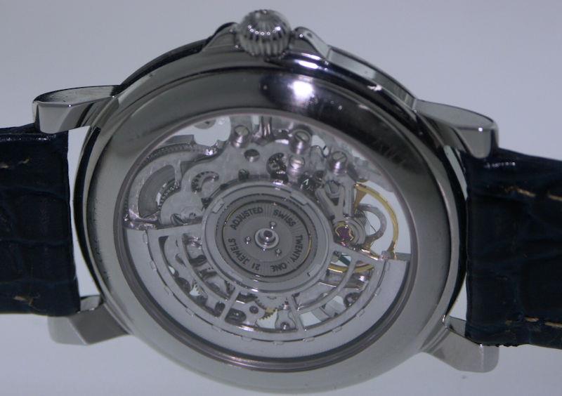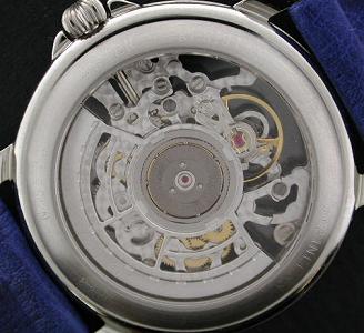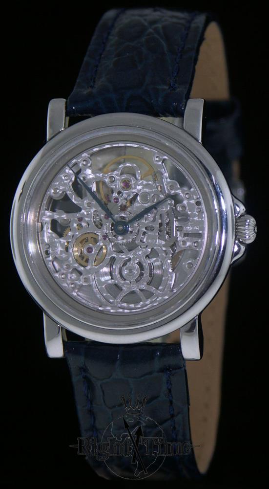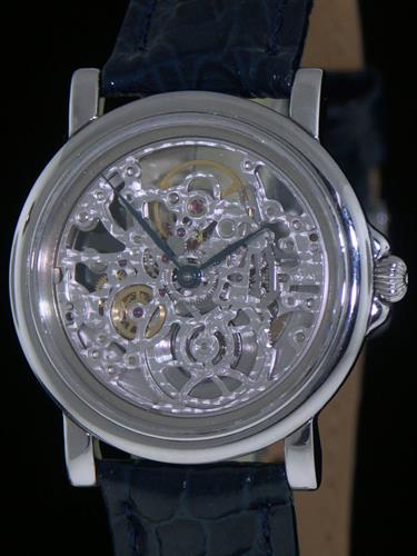 Fully skeletonized, hand enhanced Cotes de Geneve burnished plates. Rhodium color movement plates. Hand enhanced Cotes de Geneve burnished plates contrasted with fire blued screws and red ruby jewels.