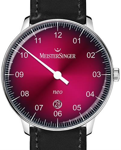MeisterSinger Neo model NE904D. Single hand operation with date window. Powered by Swiss automatic movement. Raspberry color dial in a solid stainless steel polished 40mm case on black leather strap