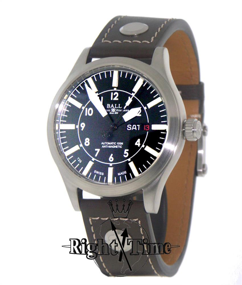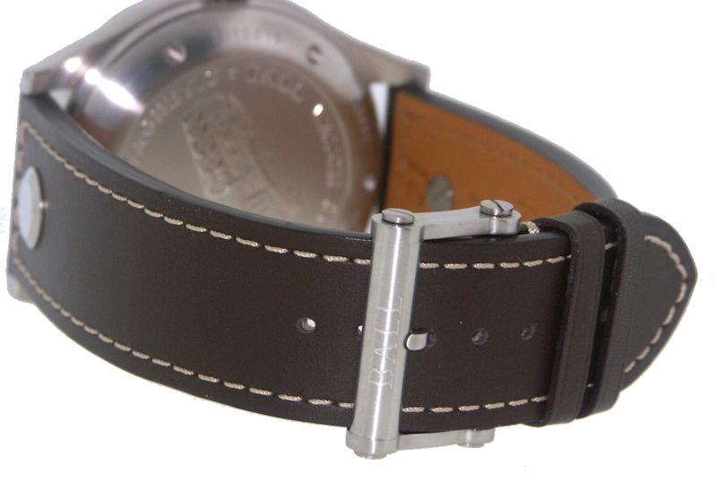 Ball Engineer Master II Aviator model NM1086CLJBK. Swiss ETA 2836-2 automatic movement with double calendar. Black dial with 15 double-sized (super bright at night) micro tubes filled with 3H luminous gas. Robust steel 44mm case with brown leather strap.