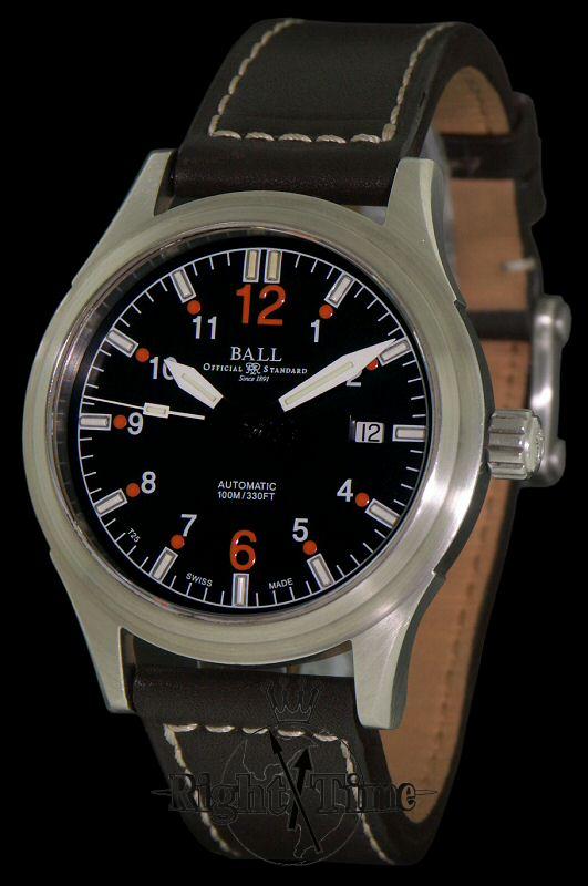 BALL Fireman NM1088C-LJ-BKOR model watch with automatic ETA movement, stainless steel case, sapphire crystal, micro gas tubes for night reading capability, orange color markers, black leather band.