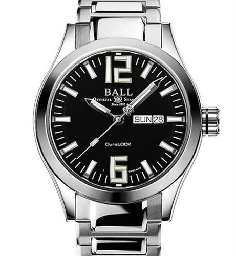 Ball Engineer III "King" model NM2028C-S12A-BK. Swiss made automatic movement. Combination finish stainless steel case and bracelet. Sapphire non-scratch crystal. Black dial with day/date calendar and steel toned tritium gas filled markers and hands. Water resistant to 100 meters.
