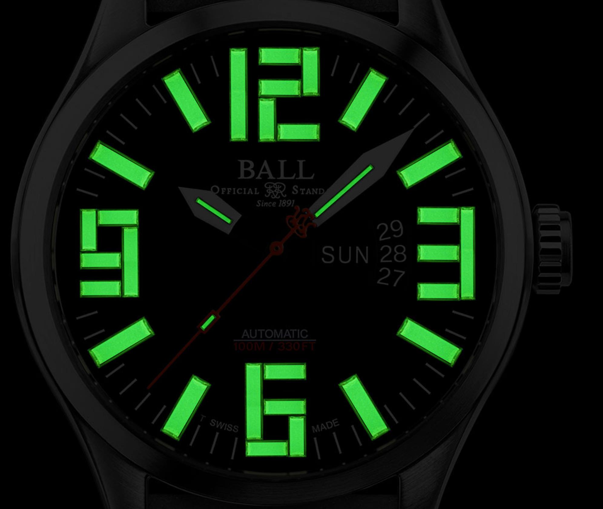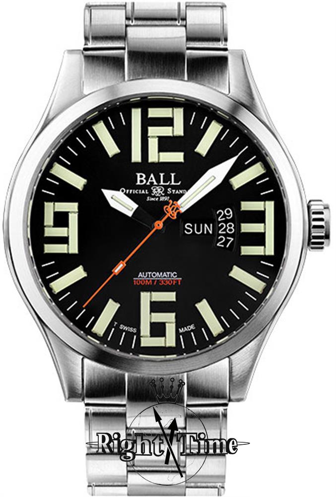 Ball Engineer Master II Aviator model NM2050C-S1A-BK. Swiss ETA2836-2 automatic movement with double calendar. Black dial with 31 double-sized (super bright at night) micro tubes filled with 3H luminous gas. Robust steel 48mm case with bracelet.