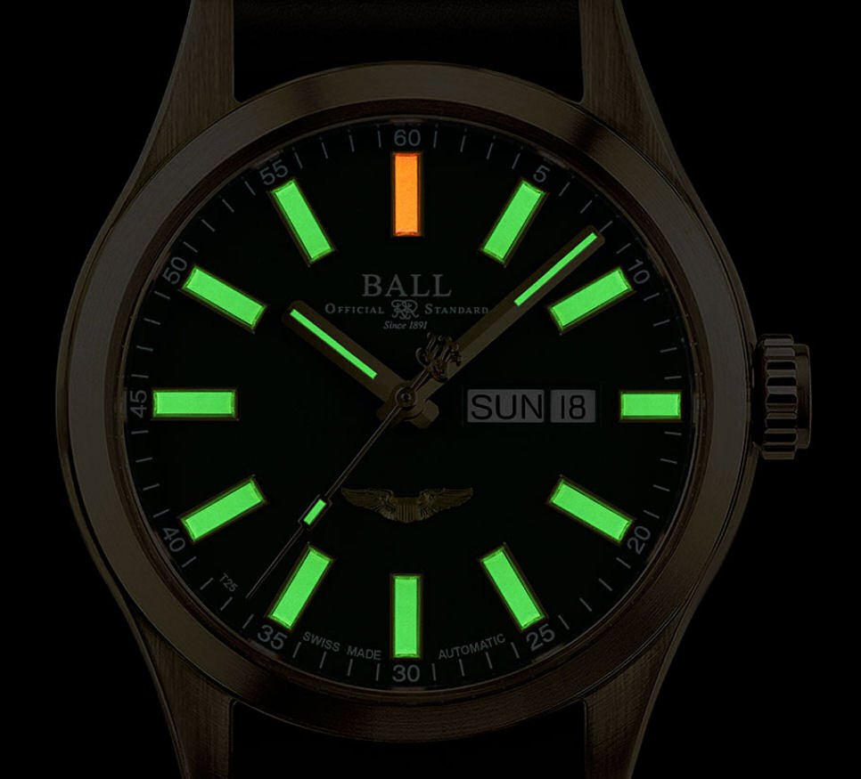 New from the Ball Engineer III series. Matte finished solid bronze case in a modern 43mm size. Black dial with tritium filled markers and bronze tone hands. Uses the Automatic caliber BALL RR1102 movement with day and date function. Brown leather strap with minimal white stitching. Sapphire crystal.