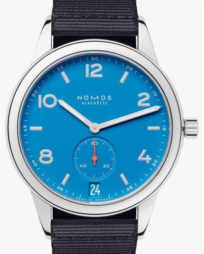 Nomos Club automatic date reference 777. Manufacture Caliber DUW 5101 automatic movement. High polished stainless steel case. Siren blue dial with superluminova filled hour numerals and indexes. Domed sapphire crystal. Blue-black woven textile strap. Water resistant to 200 meters.