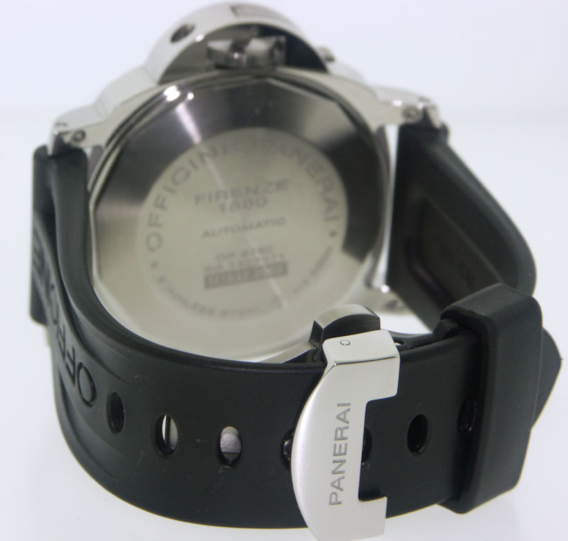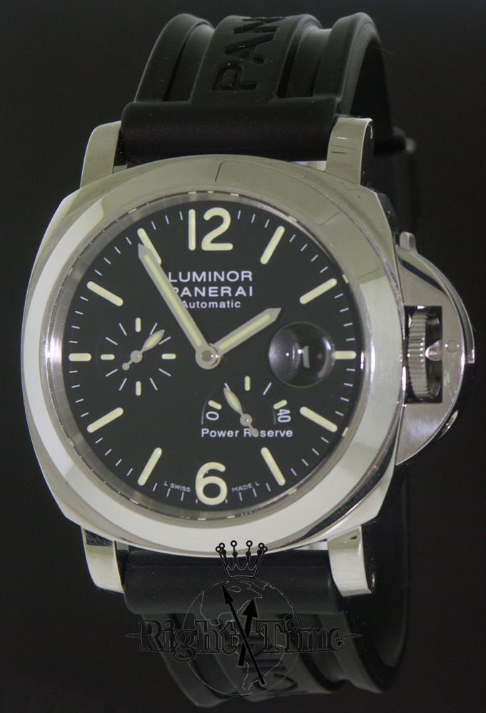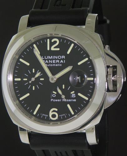 Officine Panerai Luminor model PAM00090. Modern 44mm polished stainless steel case with signature Panerai crown guard. Sharp black dial under a domed sapphire crystal with built in magnifier. Panerai Calibre 6762 movement with small seconds and power reserve indicator. Comes in a box set with both a rubber and leather strap. Limited edition of 3000 pieces.