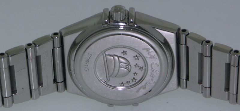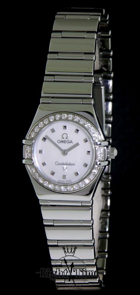 Ladies Omega "Constellation" Cindy Crawford`s "My Choice" quartz mini model 1465.71.00 in all polished stainless steel case and band, with diamond set bezel and mother-of-pearl dial