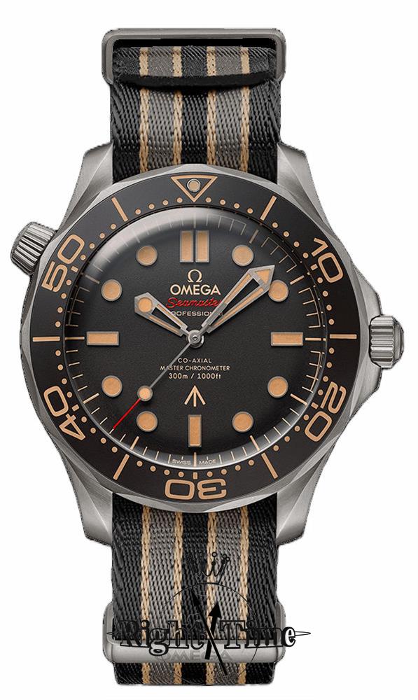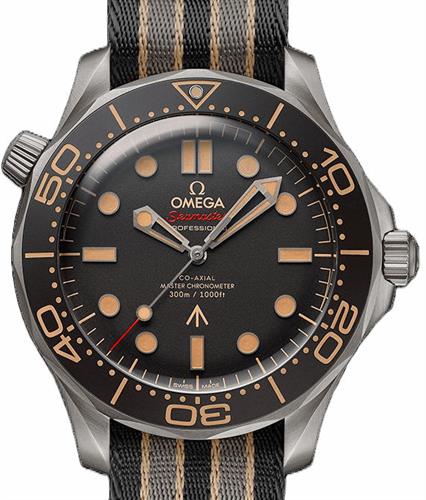 Omega Seamster James Bond 007, old style spy look of the pie-pan curved brown dial with aged looking tan color luminous dots, co-axial chronometer Claibre 8806 in titanium 42mm case on Nato style strap fitting the overall color scheme