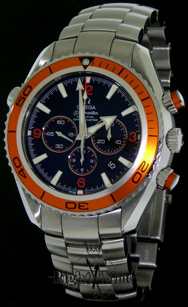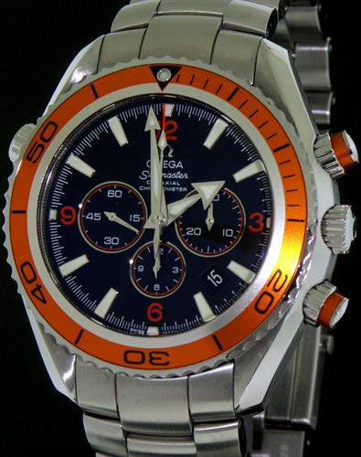 Omega Seamaster Planet Ocean, model 2218.50.00. Features Omega caliber 3313B automatic co-axial chronograph movement. Solid stainless steel case and bracelet with deployant clasp and wet-suit expansion. Black dial with orange accents and luminous hands/markers. Bright orange uni-directional rotating bezel with imprinted 60 minute scale.