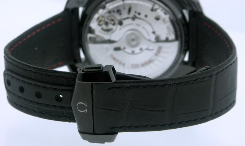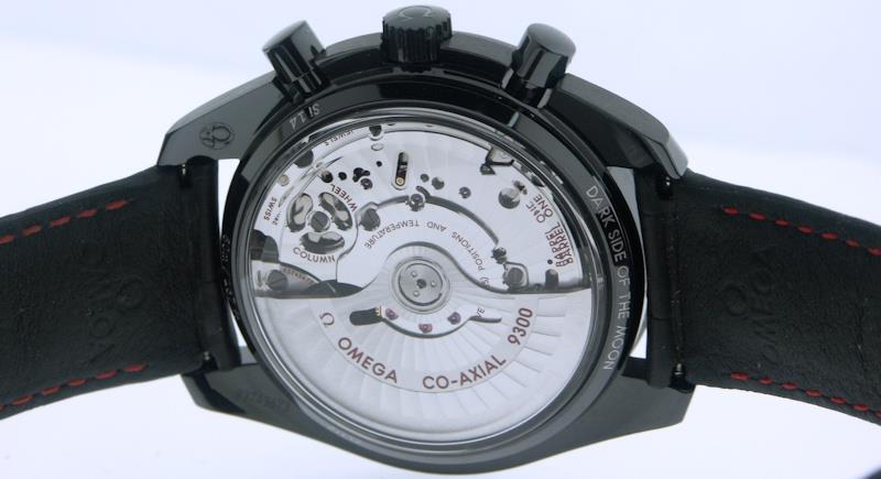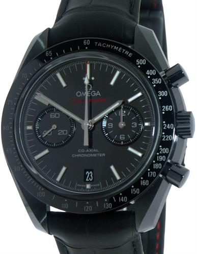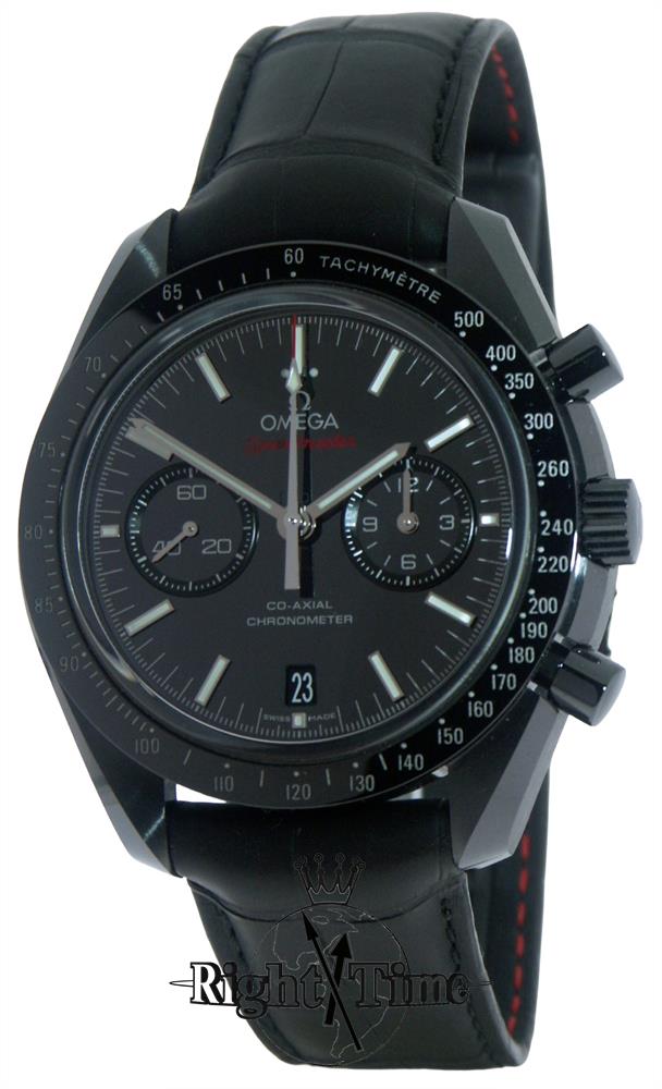 Omega Speedmaster `Dark Side of the Moon` black 44mm ceramic case model 311.92.44.51.01.007, automatic chronograph caliber Omega 9300 with black dial on Omega black alligator strap with red stitch