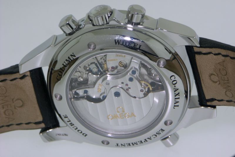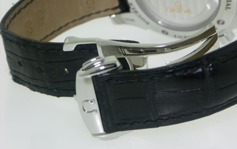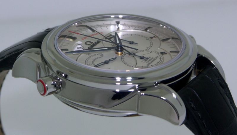 Omega "DeVille" automatic split chronograph (rattrapante) powered by Omega co-axial escapement COSC chronometer Caliber 3612 based on Frederique Piguet. Silver dial with blued steel markers and hands. Black alligator strap. Box and papers