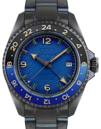 Blue color. Matte “soleil” and sandblasted dial. Indexes and applied numerals in stabilized rust (OOO® patent) with external printed Superluminova frames.