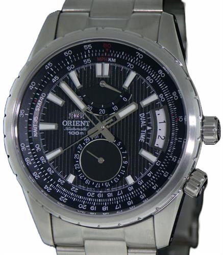 Orient Voyager Executive model DH01002B. Japanese automatic movement with power reserve, dual time GMT function, and date function. Inner rotating bezel with slide-rule calculator. Stainless steel case and bracelet. Sapphire non-scratch crystal. Black dial with pinstripe texture.