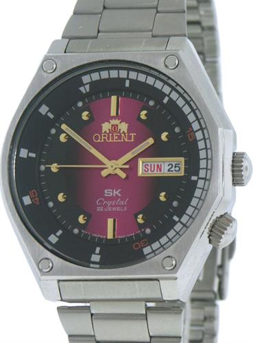 Orient SK Diver Retro model RA-AA0B02R19A. Japanese automatic movement with day/date function. Solid stainless steel case and bracelet. Black/red gradient dial with gold tone hands and accents. Mineral glass crystal. Inner rotating 60 minute bezel with separate crown.