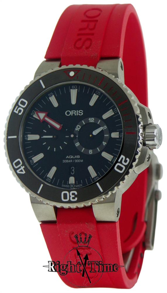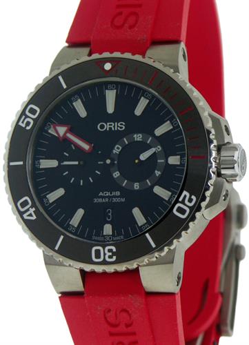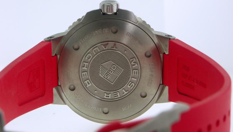 Oris regulateur "der meistertaucher" model 01 749 7734 7154-SET. Swiss made Oris Caliber 749 automatic movement. Pure titanium case. Black dial with luminous hands and markers. Uni-directional bezel with matte black ceramic insert. Comes in a set with both a red genuine rubber strap and a solid titanium bracelet. Water resistant to 300 meters. Sapphire crystal with anti-glare treatment.