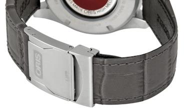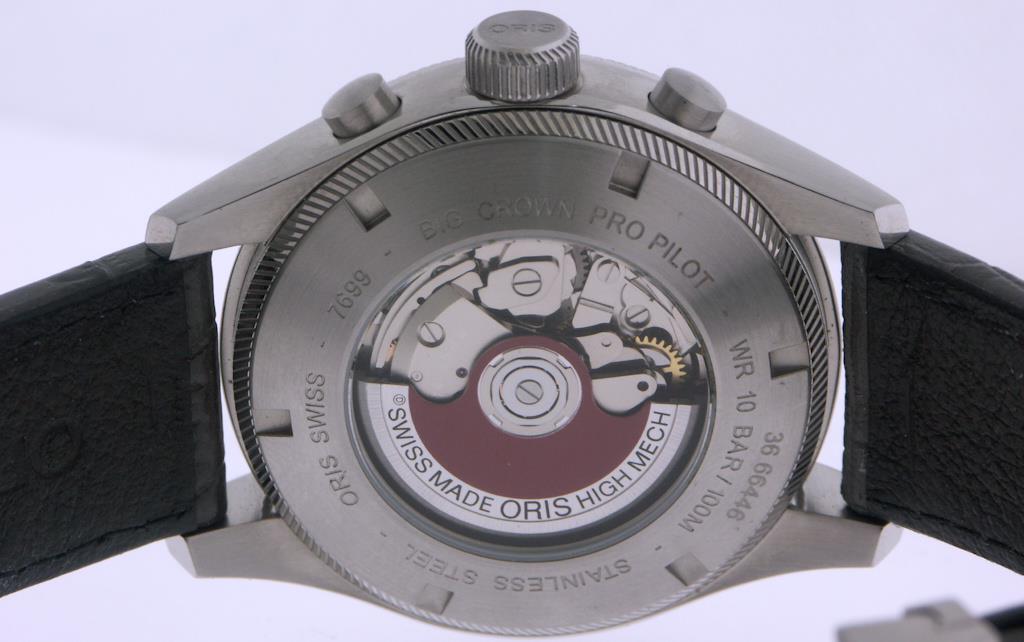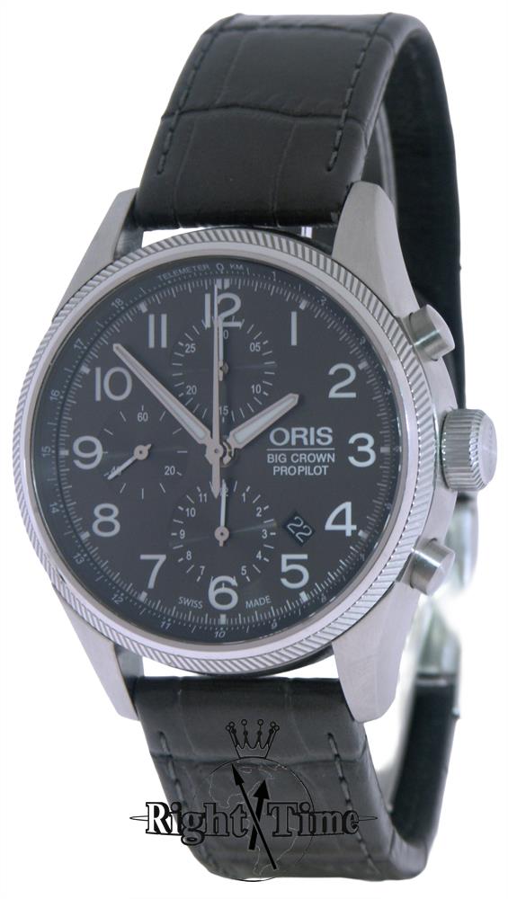 Oris Pro Pilot Big Crown 44mm stainless steel case gray dial on gray leather strap, powered by Sellita SW500 automatic chronograph movement with date