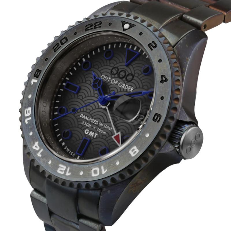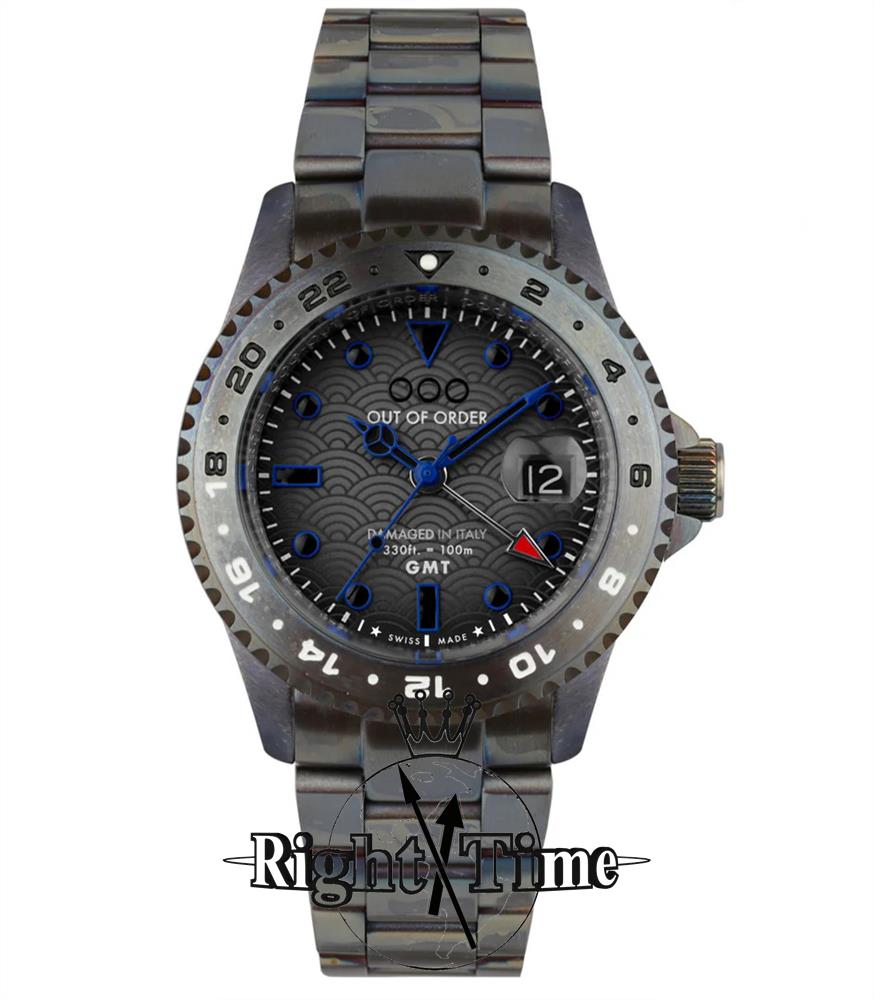 From the totally unique brand Out Of Order comes the Toyko Shibuya GMT. The case and band are made of solid 316L steel and pre-aged using OOO`s exclusive aging process. Swiss made quartz analog movement. Textured grey dial with black/blue hands and markers. Mineral glass crystal with bubble date magnifier.