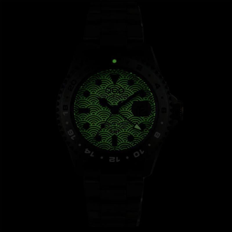 Black hands with blue frame, silver color GMT hand with red SuperLuminova insert.