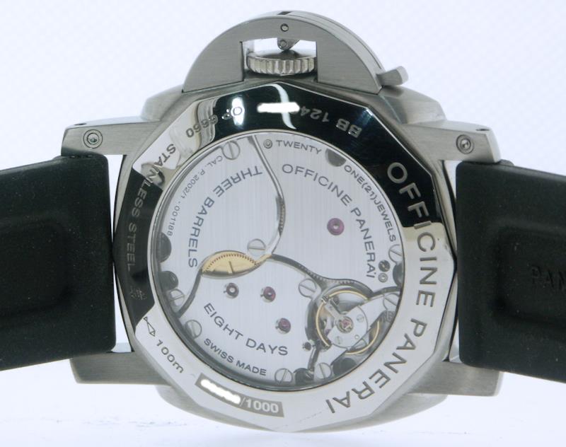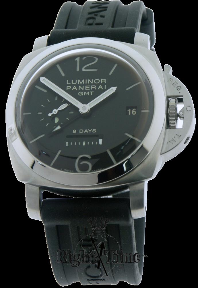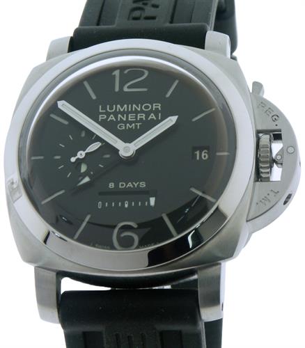 Officine Panerai Luminor 1950 8-Day GMT model PAM00233. Black/SuperLuminova sandwich style dial with cut out numerals and markers. Manual wind Panerai Calibre P.2002 movement. Solid stainless steel case. Domed sapphire crystal. Black rubber strap.
