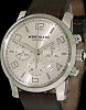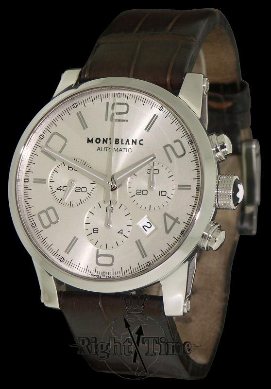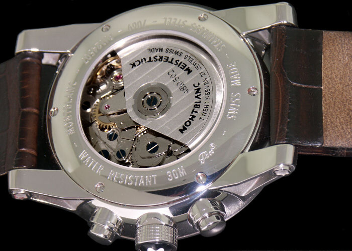 Montblanc Timewalker automatic chronograph powered by Valjoux 7753 27 jewels movement, all polished stainless steel case with observation back, and brown leather strap