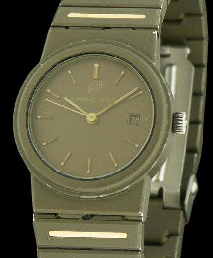 Ultra light, all titanium quartz model from Porsche Design by IWC. Military Green PVD finish case and band, 18kt solid gold inserts in links, brown dial
