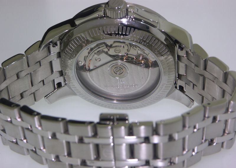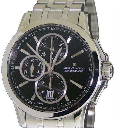 Maurice Lacroix Pontos Chronographe Retro model PT7548-SS002-330. Swiss automatic ETA Valjoux 7750 based movement. Satin and polish finished stainless steel case and bracelet. Decorated crown. Black dial with silver outlined sub-dials, date calendar, luminous hands. Water resistant to 50 meters.