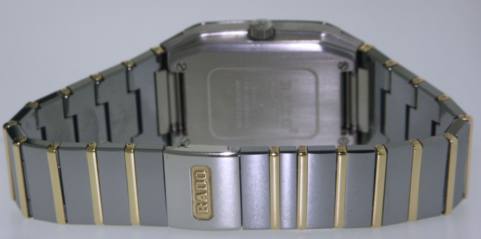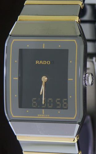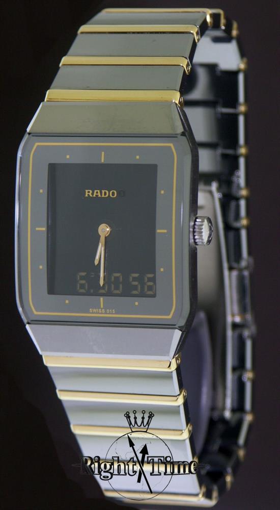 Rado Jubile version with genuine diamonds model R10365151 from Rado Anatom collection. Quartz multi-function analog-digital movement, scratch proof hard-metal wrist-hugging case, sapphire crystal enhanced with micro-fine vapor-deposit decorations(24 carat gold), black dial with diamond markers, combination 18kt solid gold bars and scratch-proof hard metal watch bracelet.