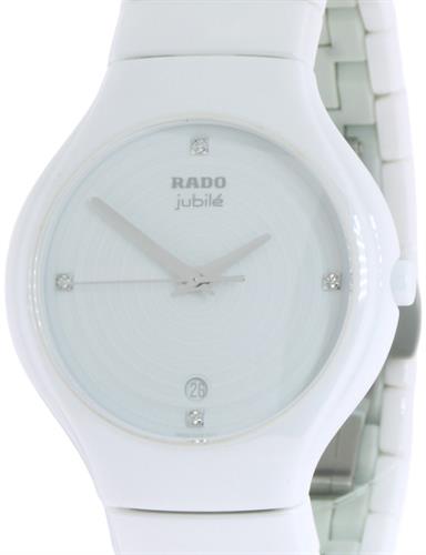 Rado True collection model R27696712. Polished high-tech 27mm white ceramic case and bracelet. White dial with 4 diamond markers. Watch is powered by a Swiss made quartz movement with date calendar. Sapphire crystal.
