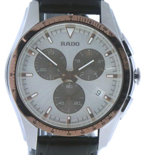 Rado HyperChrome Swiss quartz chronograph in stainless steel case with rose Ceramic bezel with tachymeter engraved scale, silver metallic dial with applied rose markers and hands