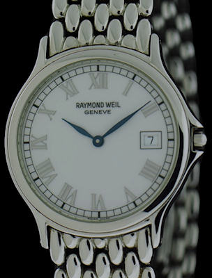 Very elegant and thin, dress Tuxedo style classic Swiss made quartz model by Raymond Weil, made from highly polished stainless steel with comfortable 7 link bracelet