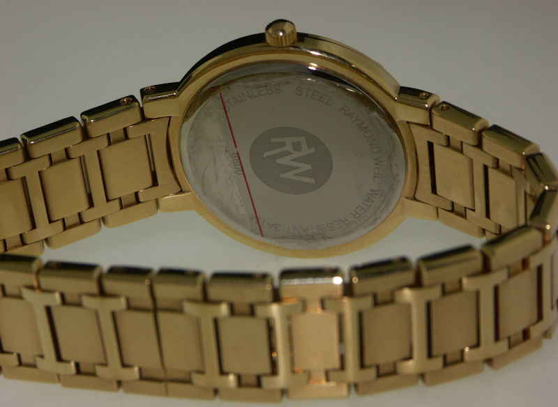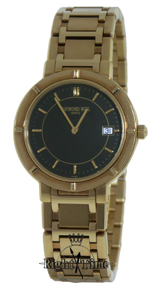 Raymond Weil Chorus model 8800. Yellow gold plated stainless steel case & bracelet. Black dial with gold tone hands & markers. Swiss made Quartz movement. Mineral glass crystal.