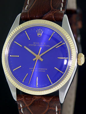 Rolex oyster perpetual 1005 model with 14kt gold fluted style bezel, powered by 26 jewels Rolex Caliber 1570 perpetual movement