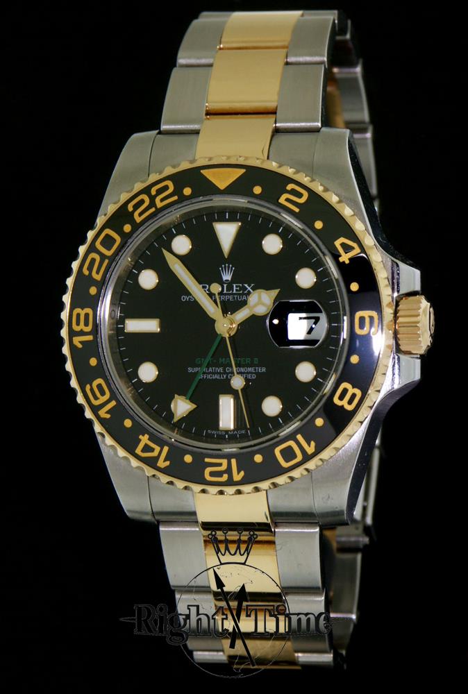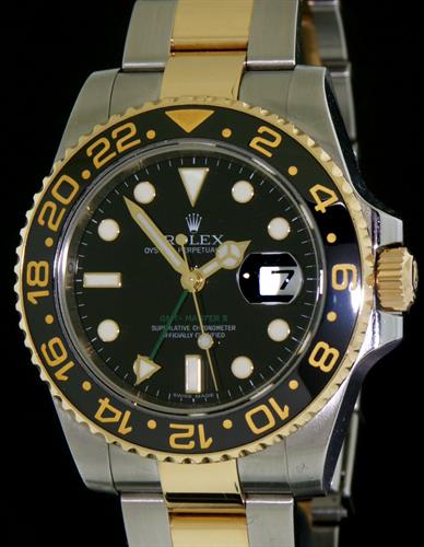 Rolex GMT-Master II, factory model 116713. Combination solid stainless steel & 18kt yellow gold. Black ceramic insert with gold tone Arabic numerals. Sapphire scratch resistant crystal with bubble date magnifier. Utilizes the Swiss made Rolex Calibre 3186 automatic movement with GMT function.