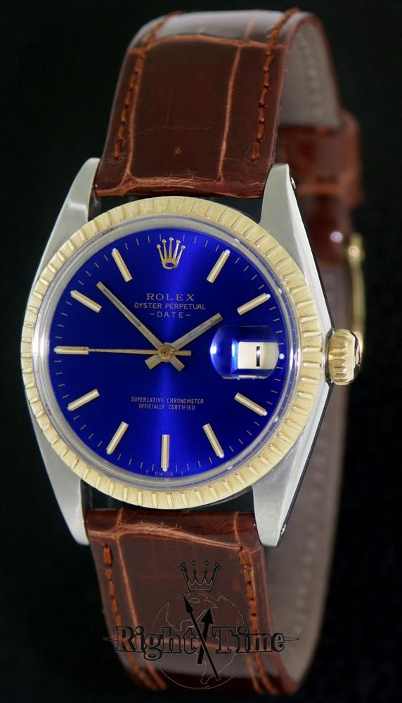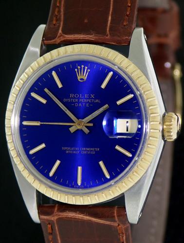 Rolex oyster perpetual "Date" stainless steel;l case with 14kt solid gold bezel, royal blue dial on alligator strap