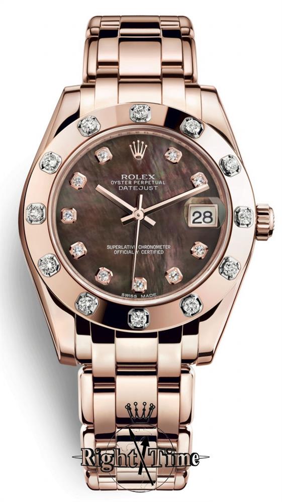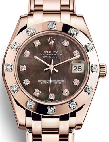 Rolex 34mm PerlMaster 18kt solid rose gold case and bracelet, black mother-of-pearl dial with 10 factory diamonds, polished bezel set with 12 factory set diamonds