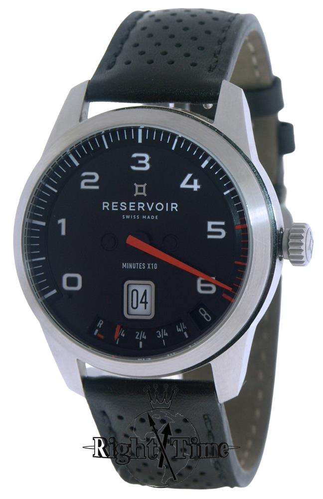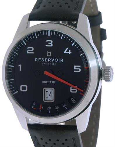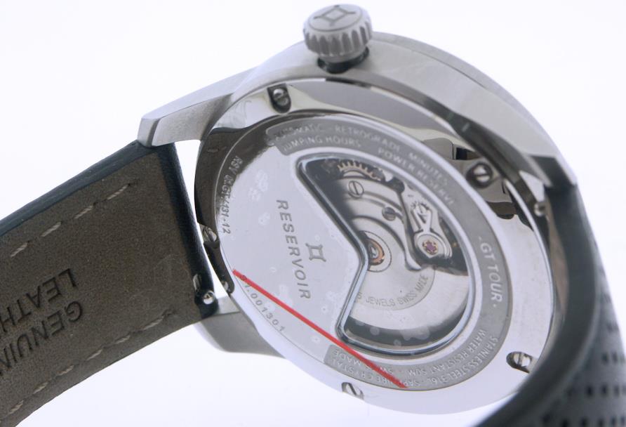 Reservoir GT Tour model RSV01.GT/131-12. "Classic" car race design with black dial and orange minute hand. Comes in satin finished stainless steel case. Watch features: retrograde minute hand; jumping hours; power reserve indicator.