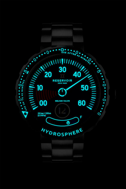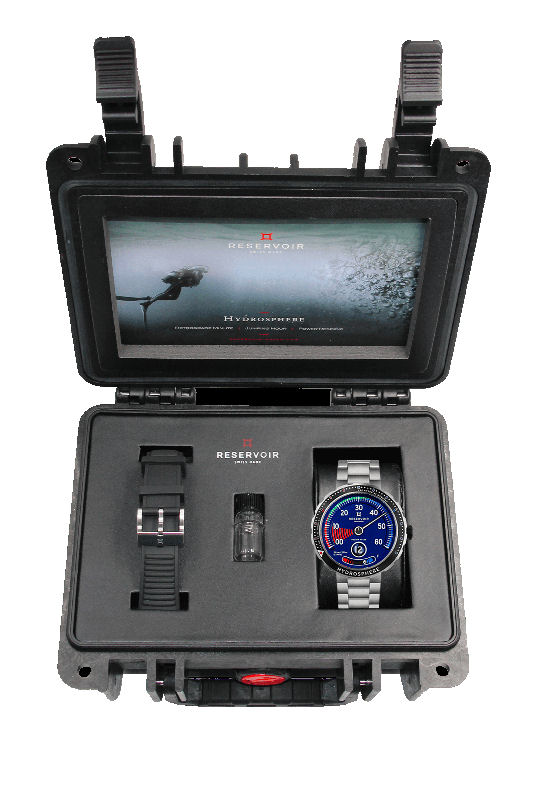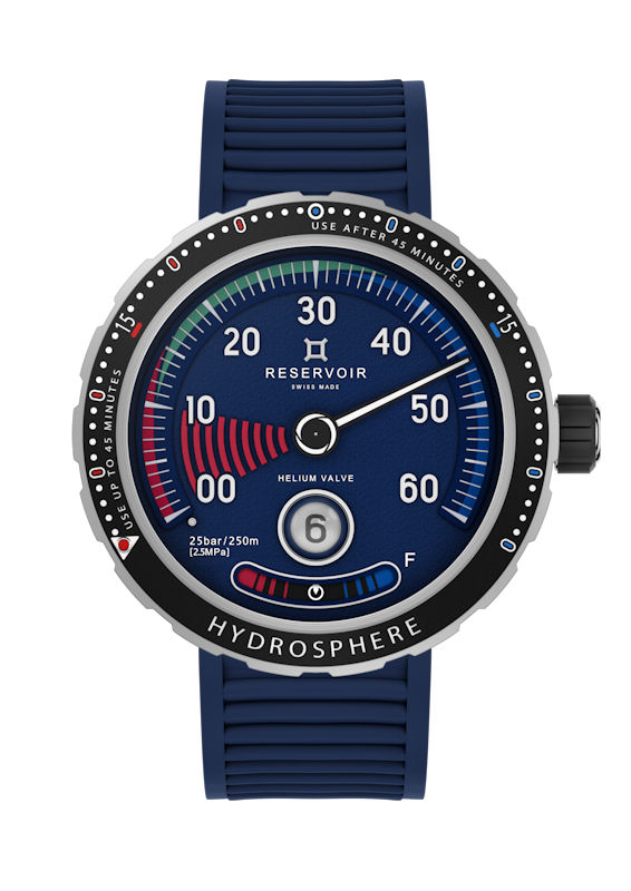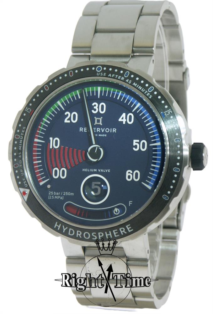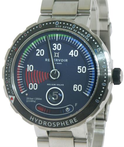 Reservoir Hydrosphere Blackfin model RSV03.HY/130-21.BH. Inspired by the pressure gauges of the first divers. Blue dial with Arabic numerals. Stainless steel case and bracelet. Comes with additional blue rubber strap. Watch features: retrograde minute hand; jumping hours; power reserve indicator. Water resistant to 250 meters.