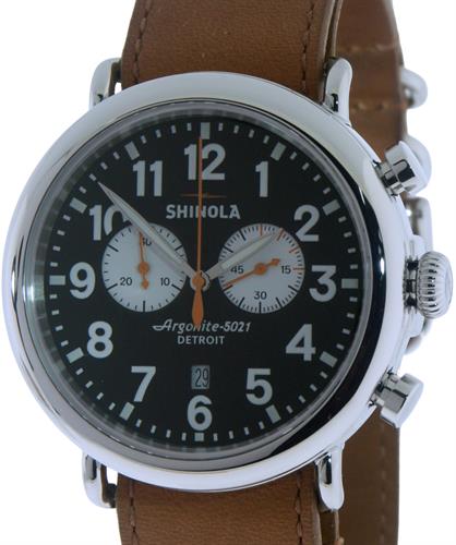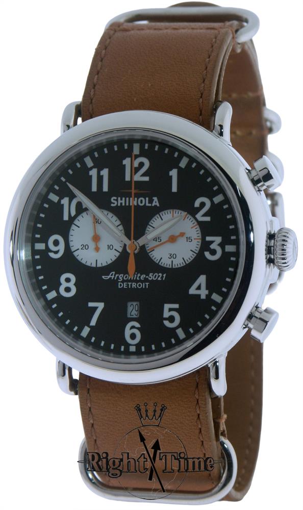 Shinola Runwell collection Model S0100048. Swiss made Ronda quartz movement assembled in Detroit. Polished stainless steel case in 47mm. Black dial with white sub-dials and orange accents. Tan NATO style leather strap. Sapphire crystal.