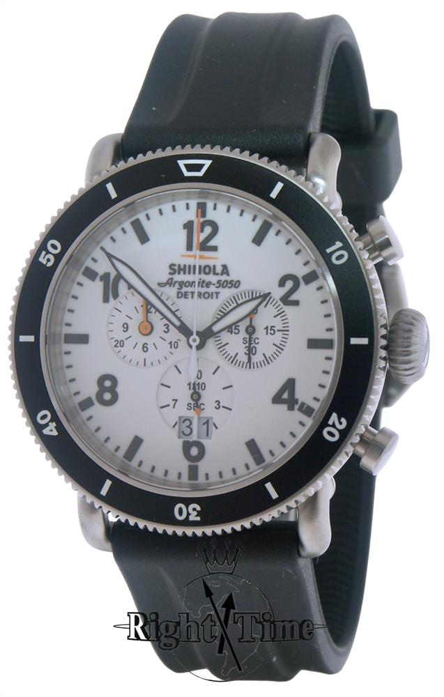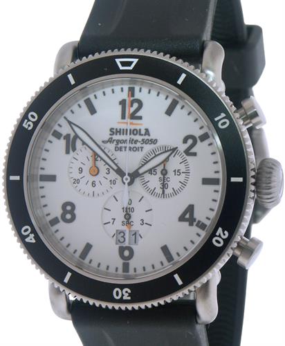 Shinola Detroit Runwell Hurricane Model S0120306528 powered by Swiss Ronda quartz chronograph movement. White color Luminous dial with black color Arabic numerals and large date calendar. Comes in large 48mm titanium case on black rubber strap. Inspired by the Great Lakes Storm of 1913, historically known as the White Hurricane.