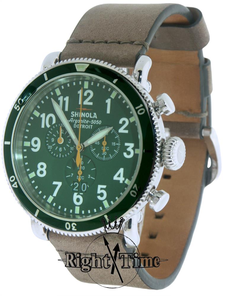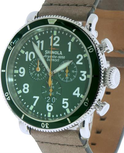 Shinola Detroit Runwell Sport Collection Model SS0110000091 powered by quarts Ronda chronograph movement. Green dial with Arabic numerals and large date calendar. Solid steel case with tan leather band.