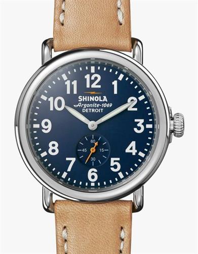 Shinola Detroit Runwell model S010000144. Powered by a Swiss quarts movement assembled at the Argonite factory in Detroit, Michigan. Midnight blue dial with bold white Arabic numerals. Polished stainless steel case on a tan genuine leather strap. Sapphire crystal.