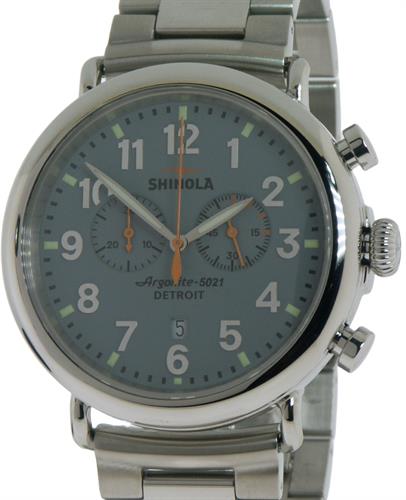 Shinola Detroit Runwell Collection Model S0110000167 powered by Swiss Ronda quarts chronograph movement. Blue/gray dial with white Arabic numerals and date calendar. Comes in stainless steel case on steel bracelet