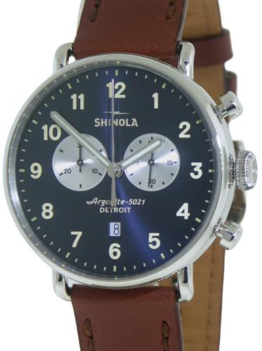 Shinola Detroit Canfield Collection model S0120001940. Swiss made Ronda quartz movement assembled in Detroit. Solid stainless steel case. Blue dial with silver color sub-dials. Sapphire crystal. Brown leather strap.