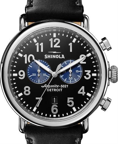 Shinola Detroit Runwell Collection Model S0120109242 powered by quarts chronograph movement. Black dial with silver applied Arabic numerals and date calendar. Comes in 47mm stainless steel case on black leather band.
