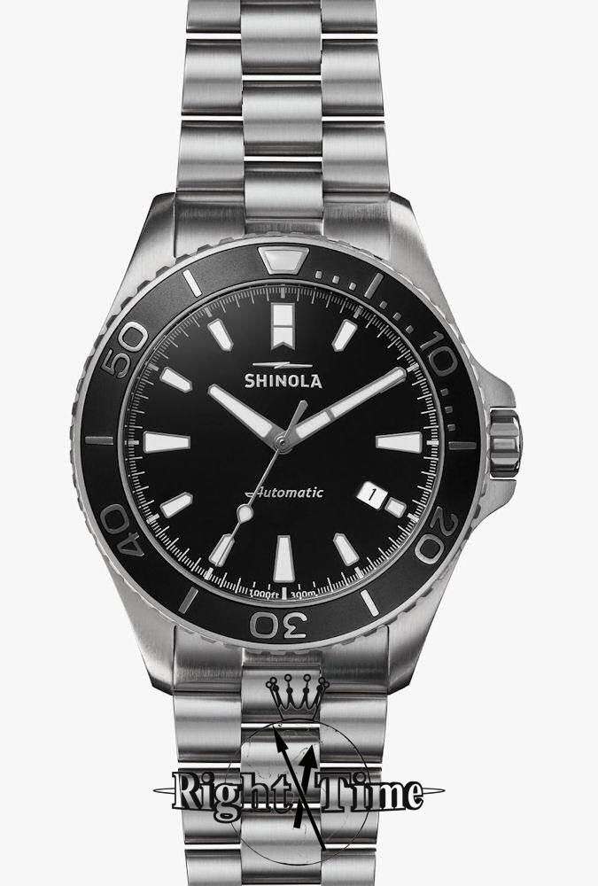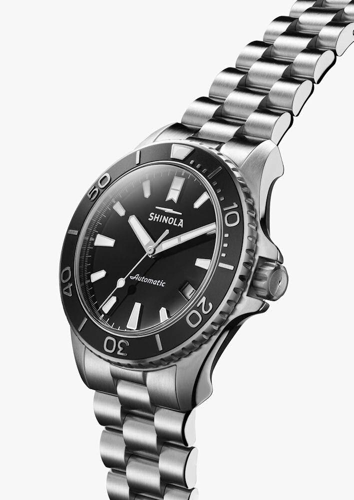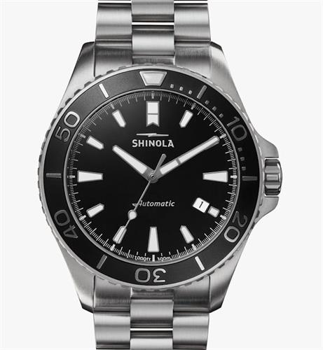 Shinola Detroit Lake Superior Monster Automatic watch model S0120143978. Powered by a Sellita SW200-1 automatic movement. Black dial with luminous hands and hour markers. Solid stainless steel case and bracelet. Water resistant to 300 meters. Domed sapphire crystal.