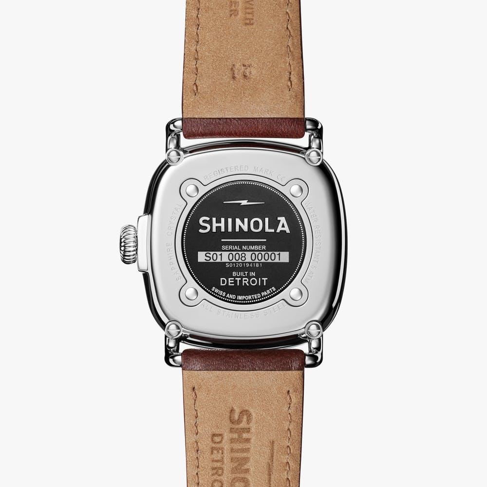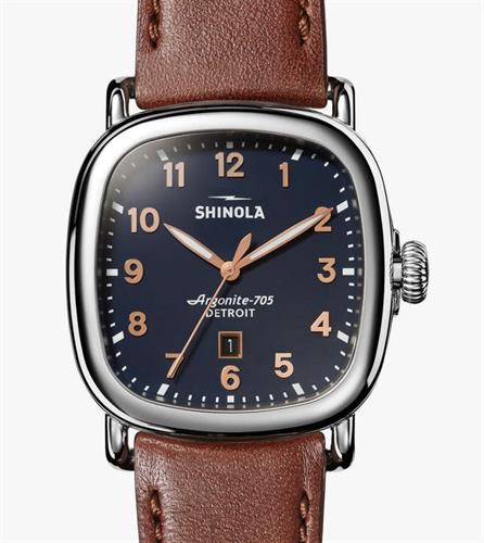Shinola Detroit Guardian Collection Model S0120194181. Swiss made Quartz analog movement. Midnight blue dial with rose tone Arabic numerals. Comes in stainless steel case on a brown leather band. Sapphire crystal.