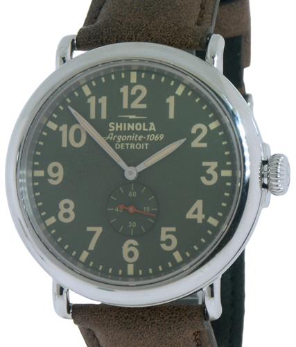 Shinola Detroit Runwell Collection Model S0120250579. Powered by a Ronda Swiss quartz analog movement hand assembled in Detroit. Olive green dial with khak Arabic numerals and a small seconds sub-dial. Comes in a polished 47mm stainless steel case. Brown microfiber leather band made by Hadley Roma. Sapphire crystal.