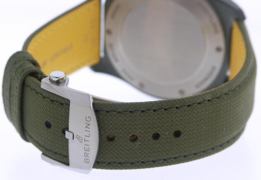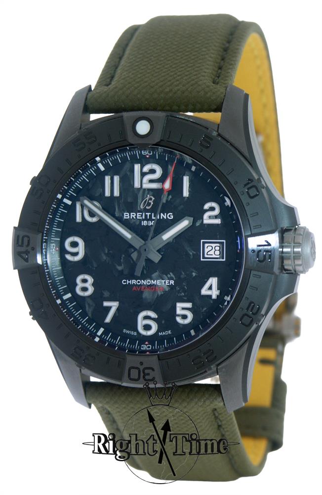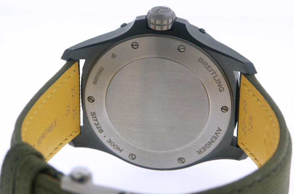 Breitling Avenger automatic 42 Night Mission model S17328101B1X1. Black ceramic case and uni-directional 60 minute bezel. Carbon fiber dial with luminous hands and Arabic numerals. Green textured leather strap with deployant buckle. Sapphire crystal. Water resistant to 30 bars.
