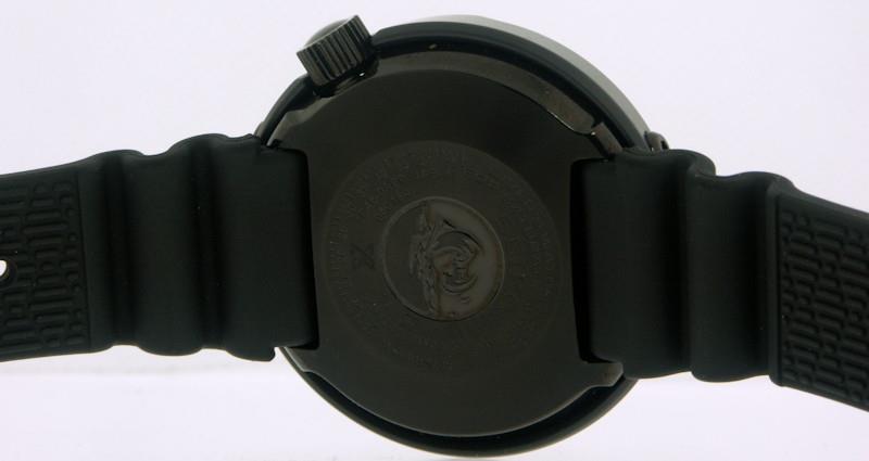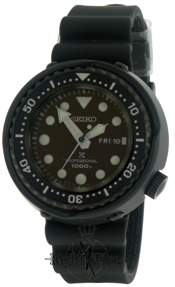 Seiko Prospex Diver S23631. Special Edition. Re-creation of 1975 Saturation Diver watch. Powered by Seiko Calibre 7C46 quartz movement. Titanium black pvd case with ceramic shroud. Black silicone rubber band. Black dial with large luminous hands and markers. 1000 meters water resistant.