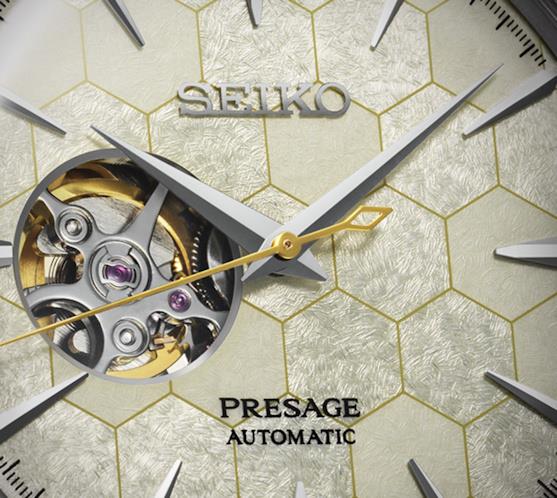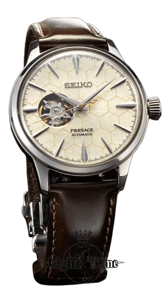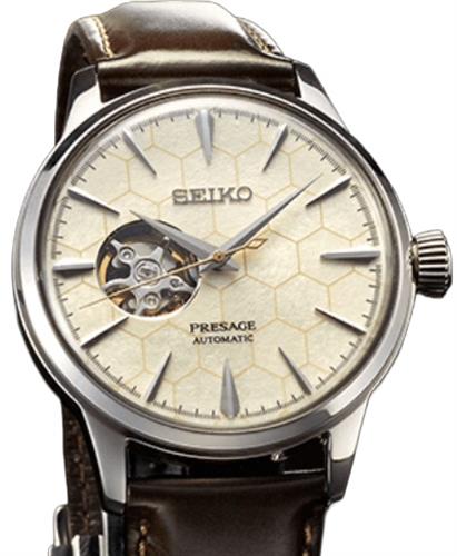Seiko Presage Limited Edition Ginza Star Bar`s HoneyComb Cocktail Time model SARY159. 50m Water Resistant. SEIKO Japanese made 23 jewel Automatic movement 4R38. 40.5mm stainless steel case, screw-down crown and observation case back. Brown leather strap
